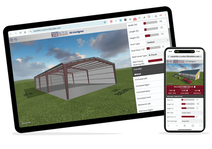 OUR 3D Design Tool is a powerful, web-based platform designed to let you visualize and customize your own metal building in real time. It’s incredibly easy to use, even for beginners – no downloads or design experience needed. The intuitive interface allows you to drag, rotate, zoom, and instantly modify dimensions, colors, poor styles, doors, and windows. Watch your design come to life as you build it, helping you make confident decisions before starting construction.